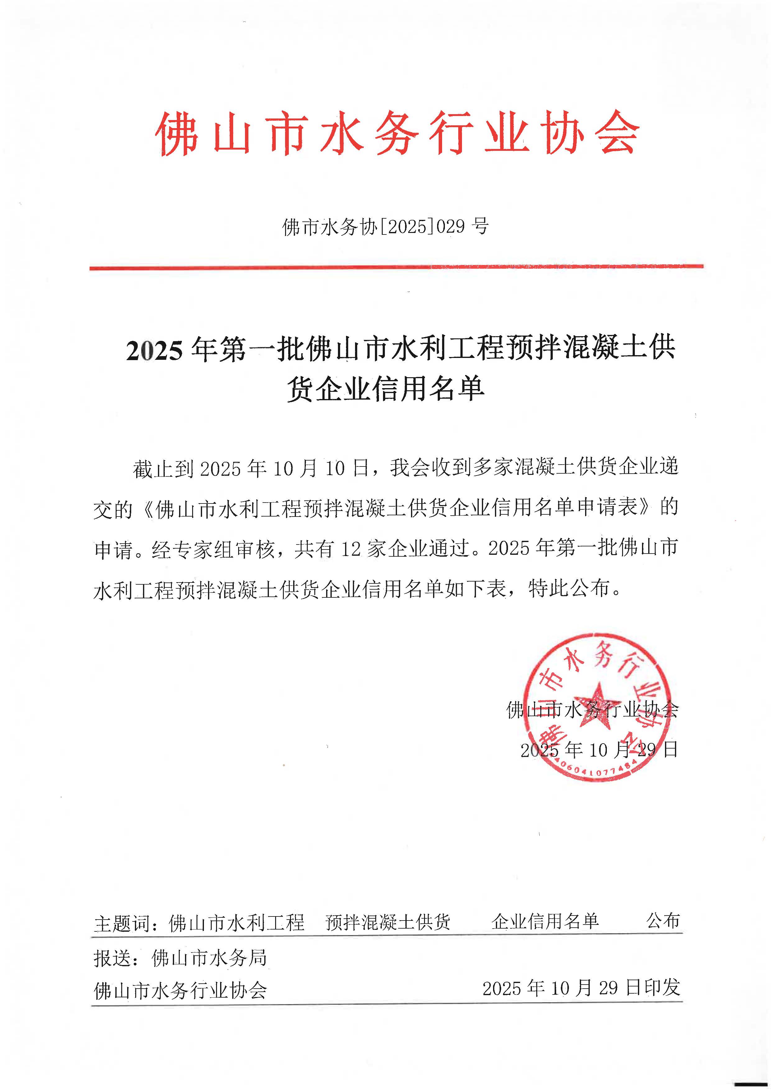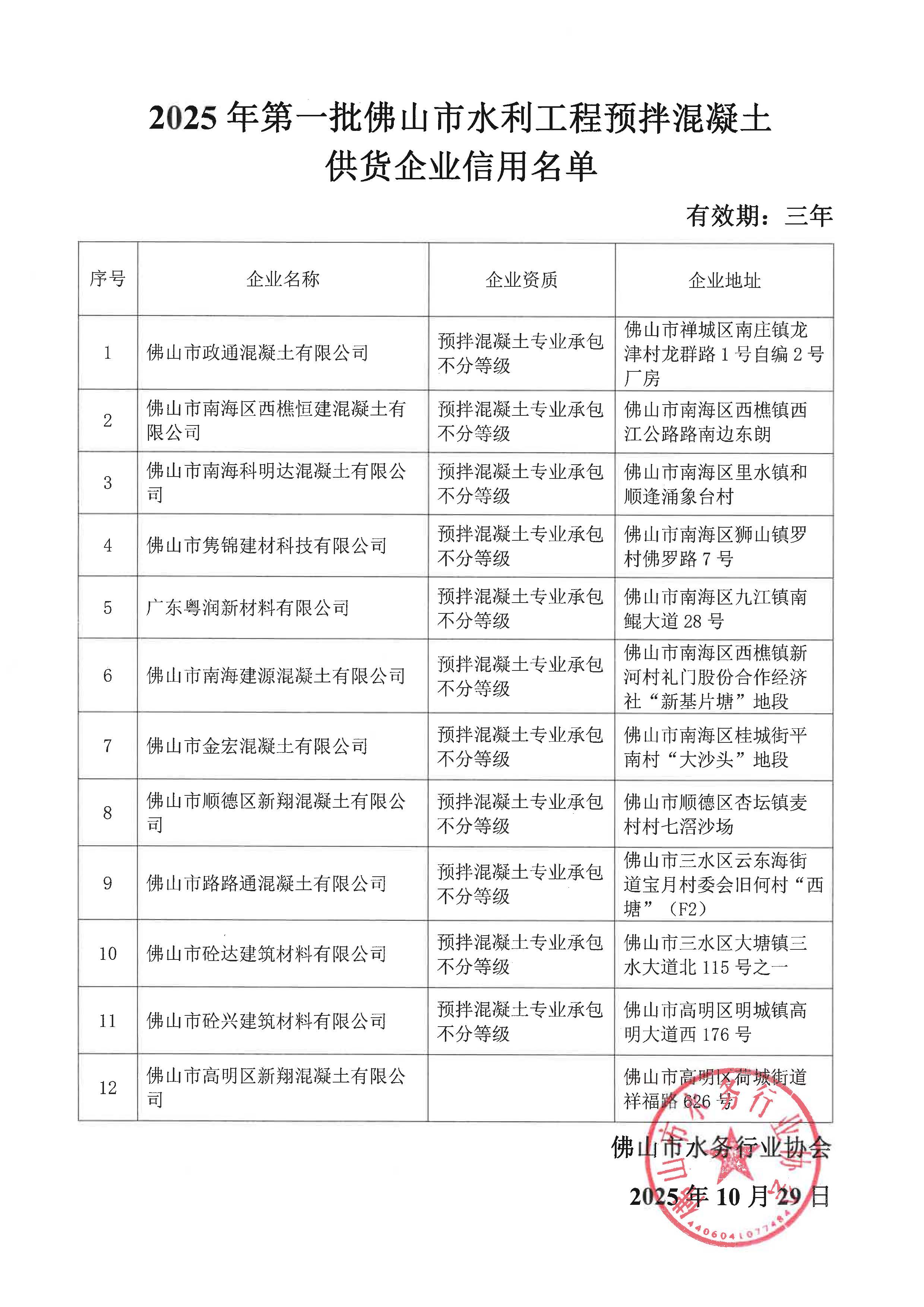 2025年第一批佛山市水利工程预拌混凝土供货企业信用名单